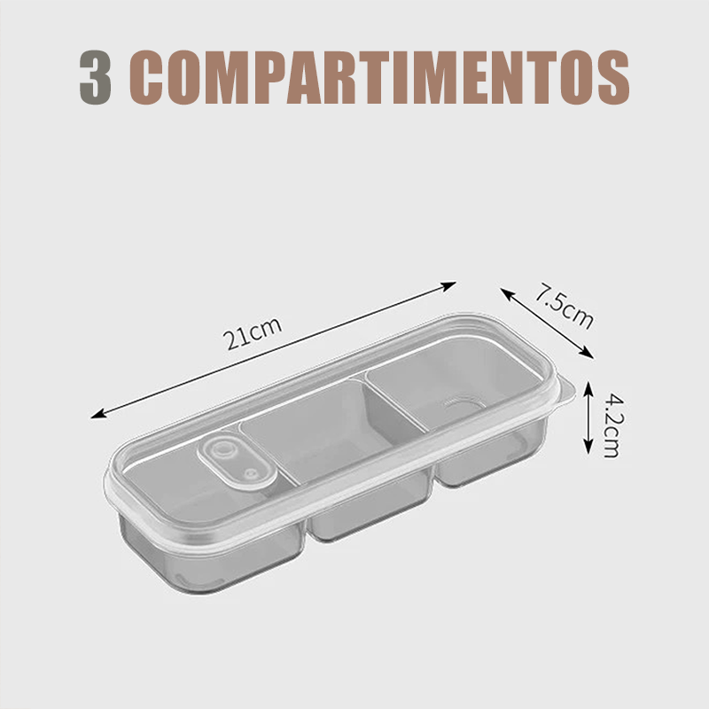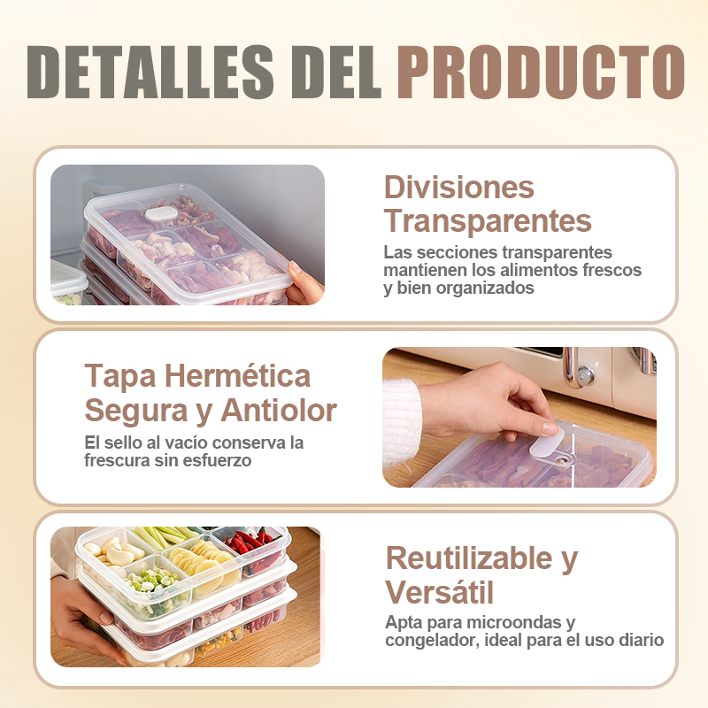 DIVISIONES TRANSPARENTES: Mantén los ingredientes frescos y organizados gracias a las secciones divididas y transparentes. Guarda diferentes tipos de alimentos en un solo recipiente sin que se mezclen. Ahorra espacio en el refrigerador o despensa apilándolos o colocándolos de lado.