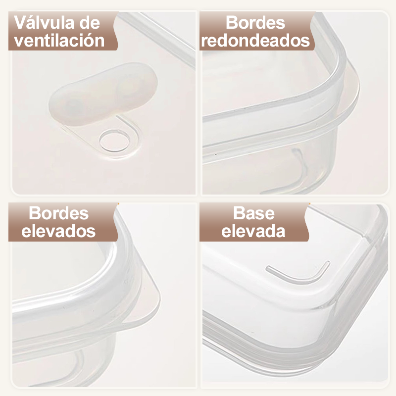 TAPA HERMÉTICA, SEGURA Y ANTIOLOR: La tapa con sello suave garantiza un cierre al vacío para conservar la frescura. Sus bordes elevados y orificios de ventilación permiten abrirla fácilmente. El diseño elevado de la base evita que el recipiente se adhiera a la superficie, manteniendo la limpieza y facilitando su uso.