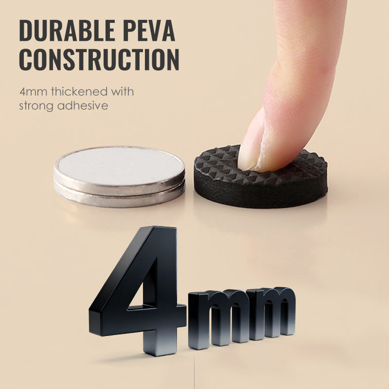 CONSTRUCTION DURABLE EN PEVA - Fabriqués à partir d'un matériau PEVA robuste avec une épaisseur de 4 mm, ces patins offrent une durabilité et des performances fiables. Le support auto-adhésif résistant garantit une fixation sûre aux pieds des meubles, offrant une protection à long terme sans remplacement fréquent, même en cas d'utilisation quotidienne.