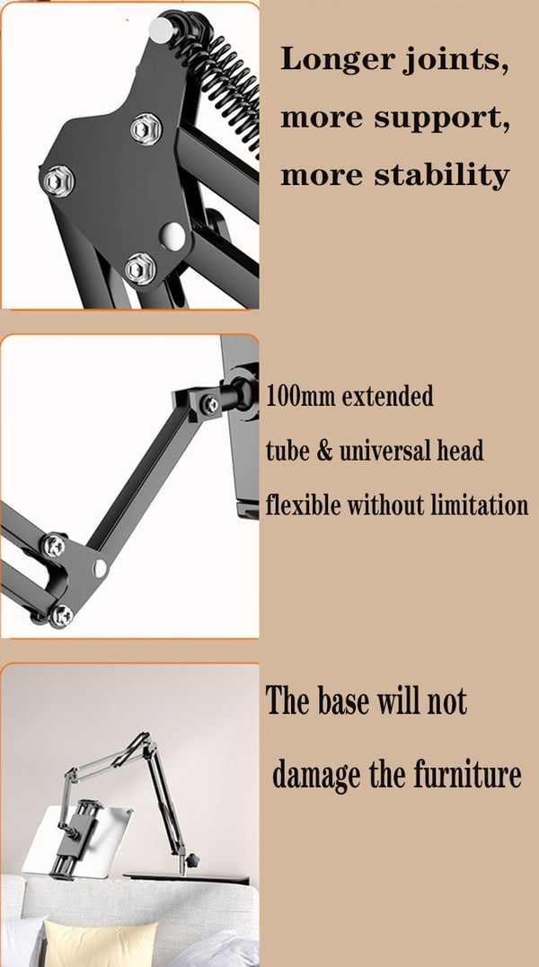 Vous pouvez l'utiliser dans n'importe quelle niche ou surface, comme une tête de lit, un canapé ou un bureau. Que vous soyez debout, assis, penché ou même couché, libérez vos mains et profitez de ce bras robotisé.