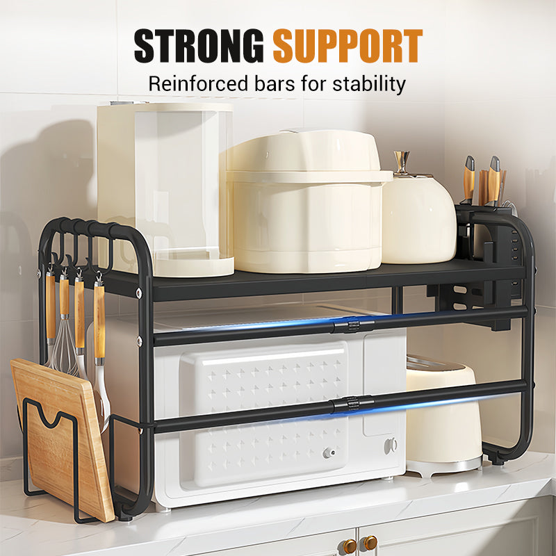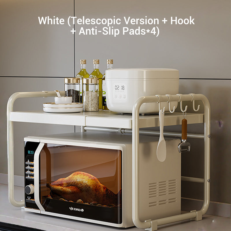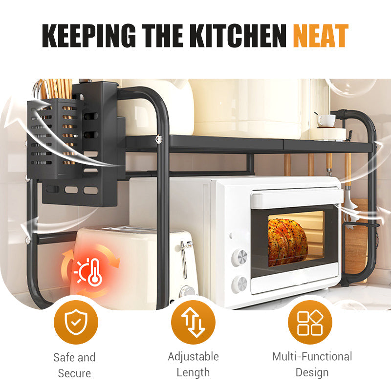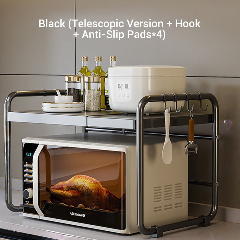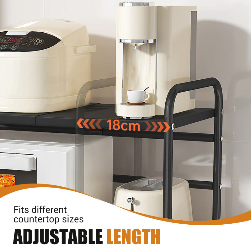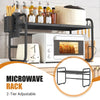 LONGUEUR RÉGLABLE - La grille à micro-ondes réglable à 2 niveaux présente une conception télescopique qui permet aux utilisateurs d’étendre ou de rétracter le cadre pour s’adapter parfaitement à différentes largeurs de comptoir. Que votre cuisine ait des surfaces compactes ou des surfaces plus grandes, la longueur flexible assure une utilisation optimale de l’espace. L’installation se fait sans outil et sans effort, ce qui facilite le repositionnement de la grille en fonction de la disposition de la cuisine ou des besoins de rangement, offrant une solution transparente pour la gestion de l’espace.
