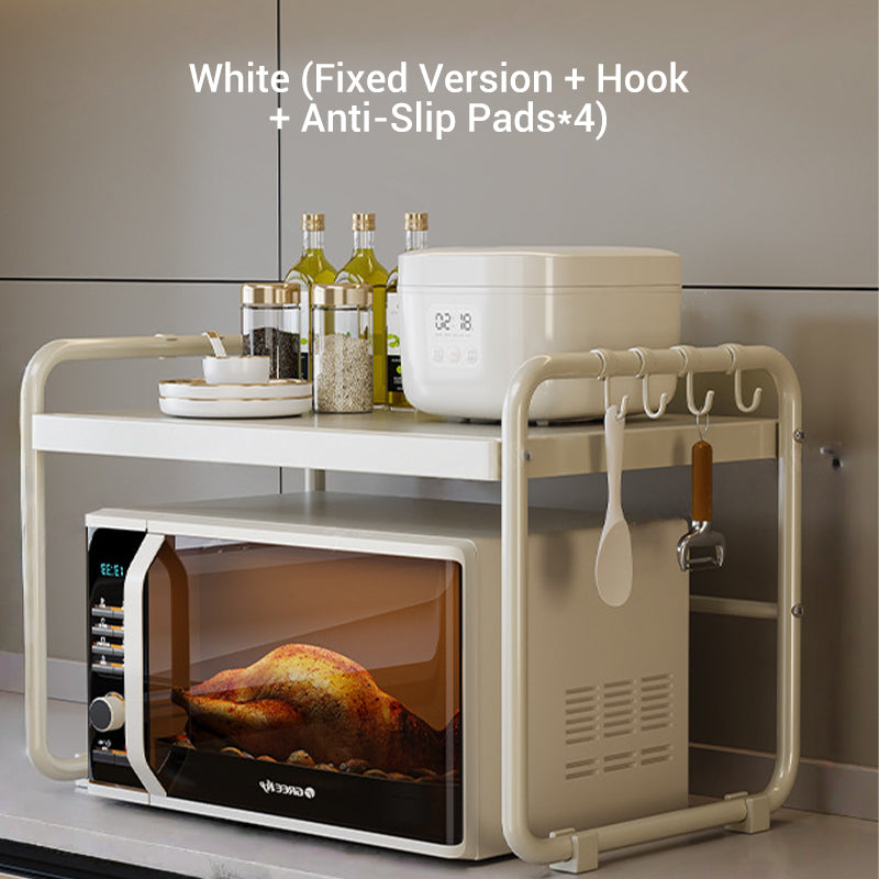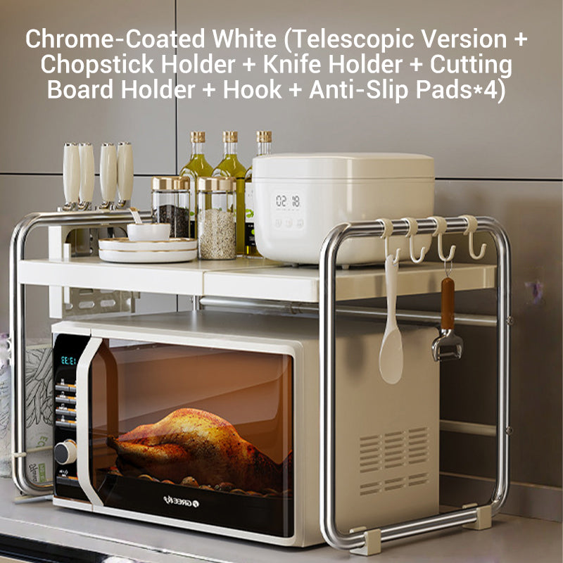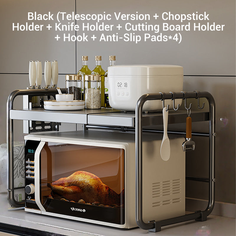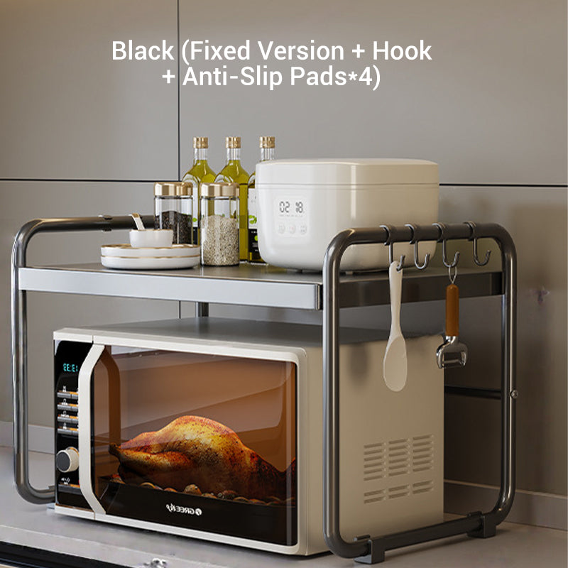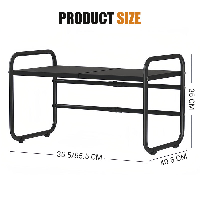 LONGUEUR RÉGLABLE - La grille à micro-ondes réglable à 2 niveaux présente une conception télescopique qui permet aux utilisateurs d’étendre ou de rétracter le cadre pour s’adapter parfaitement à différentes largeurs de comptoir. Que votre cuisine ait des surfaces compactes ou des surfaces plus grandes, la longueur flexible assure une utilisation optimale de l’espace. L’installation se fait sans outil et sans effort, ce qui facilite le repositionnement de la grille en fonction de la disposition de la cuisine ou des besoins de rangement, offrant une solution transparente pour la gestion de l’espace.