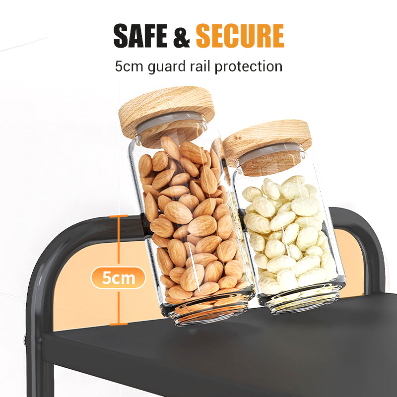 SÛR et SÉCURISÉ – Le support est doté d’un garde-corps surélevé de 5 cm qui empêche les articles placés sur les étagères de glisser. Ce rail de protection maintient les ustensiles de cuisine, les conteneurs et les petits appareils en sécurité tout en maintenant un accès facile et une facilité d’utilisation du comptoir. Sa conception améliore la sécurité sans prendre de place supplémentaire ni interférer avec les tâches quotidiennes de la cuisine.